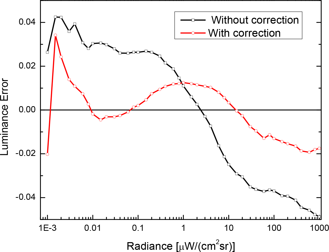 圖 10 以清晰的圖表形式,直觀地展示了本文所研究的 VSX 光源系統,在啟用其內建的光源色溫與光譜校正功能之前,以及在啟用了該校正功能之後,其計算得到的亮度輸出值 (cd/m²) 與其同時量測得到的寬頻輻射亮度輸出值 (µW/(cm²sr)),這兩者之間的比率,我們稱之為亮度-輻射亮度轉換係數或 L/R 比率,是如何隨光源總體輸出水平的變化而發生改變的。從該圖的數據曲線中可以非常明顯地觀察到,如果在光源控制系統中,沒有透過對燈絲加熱電流的精密調控來實施有效的光源色溫與光譜校正,那麼,這個重要的 L/R 比率會隨著光源整體輸出亮度的降低而呈現出持續且顯著的下降趨勢,在測試範圍內的最低亮度點,其最大降幅已接近 9%。這一現象的直接後果是,在不同的輸出亮度水平下,即使光源的總輻射亮度可能已經被閉迴路系統控制得相當準確,但由於其輸出光譜形狀發生了改變,導致最終計算得到的亮度值也會因此而產生顯著的、與亮度水平相關的系統性誤差。與此形成對照的是,在對該光源系統實施了有效的光譜校正之後,如圖所示,該 L/R 比率在光源的整個可調動態範圍內,表現出了更佳的穩定性與一致性。儘管在整個動態範圍的極低輸出端附近,由於光譜校正技術本身的局限性、以及極低光訊號下量測不確定度的增加等因素的綜合影響,該 L/R 比率仍然會出現一個幅度約為 5% 的最大偏差,但相較於未進行任何光譜校正時的情況,其穩定性已經得到了極為顯著的改善,這對於需要精密亮度控制的應用而言至關重要。