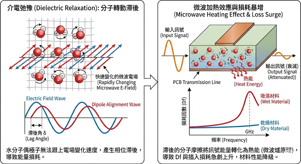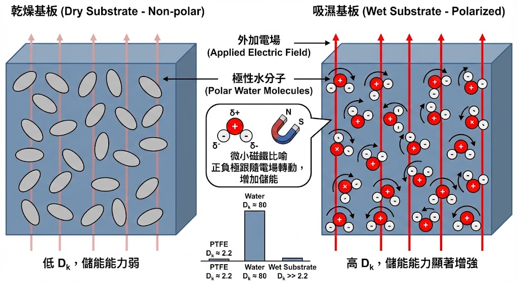 水是一種強極性分子,您可以將每一個水分子想像成一個微小的磁鐵,具有正極與負極,在電路板通電產生電場時,這些「小磁鐵」會嘗試跟隨電場的方向進行排列與轉動;儲能效應增強:介電常數 (Dk) 本質上代表材料儲存電能的能力,當非極性的基板材料(如 PTFE)吸收了極性的水分子,材料內部能響應電場的粒子變多了,整體儲存電能的能力就會顯著上升,這就像是在原本平靜的池塘中加入了許多活躍的魚,整體的波動能量自然增加,由於水的 Dk 值是一般基材的 20 倍以上,極少量的水就能顯著拉高整體的 Dk 值。