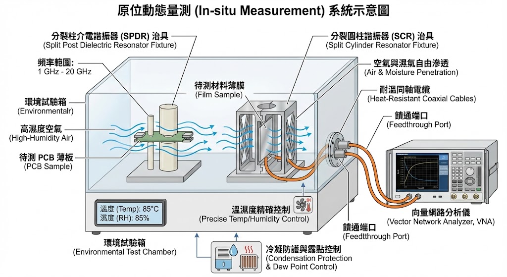 傳統做法是將樣品放入高溫高濕箱(如 85°C/85% RH)一段時間,取出後拿到常溫環境下的儀器上測量,問題是樣品離開濕熱環境的瞬間,水分就開始揮發(排濕效應),等到架設好治具開始測量時,樣品的含水量已大幅下降,導致測得的數據嚴重低估了濕度的影響,這就像把冰淇淋拿出冰箱後過十分鐘才量溫度,數據絕對不準確。