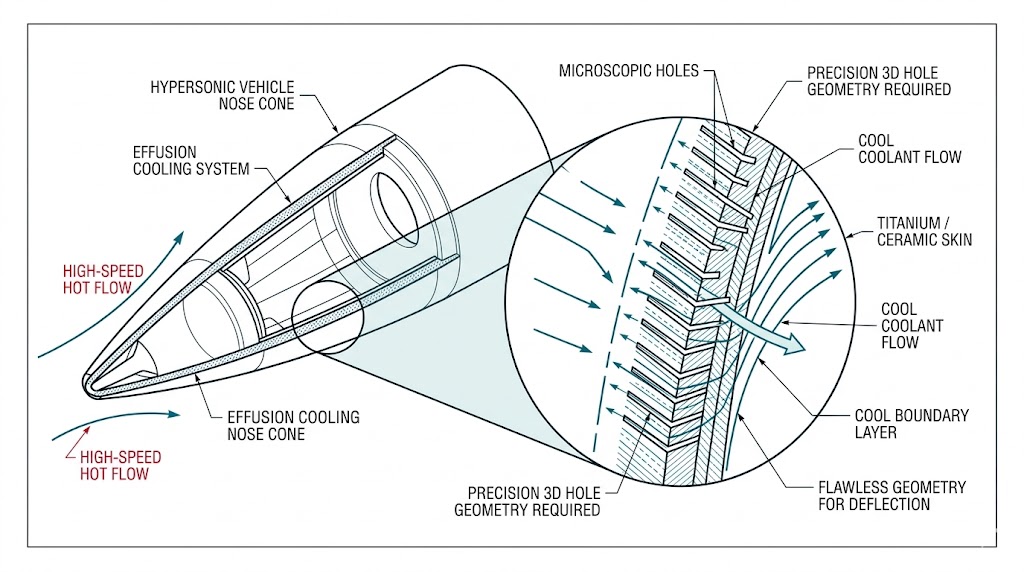 在不對稱作戰與極音速(Hypersonic)飛行載具發展中,無論是高空無人機(HALE UAV)的保形 ISAC 天線,或是突防飛彈的陶瓷雷達罩(Radome),皆面臨著極端氣動力熱(Aerodynamic Heating)的嚴酷考驗,為了讓內部的紅外線尋標器與相位陣列雷達在攝氏數千度的高溫下正常運作,航太工程師必須在厚達數公厘的金屬合金或氮化矽(Silicon Nitride)透波外殼上,打出數以百萬計、直徑僅有一百微米(Microns)的「氣膜冷卻孔(Effusion Cooling Holes)」或微波穿透孔。