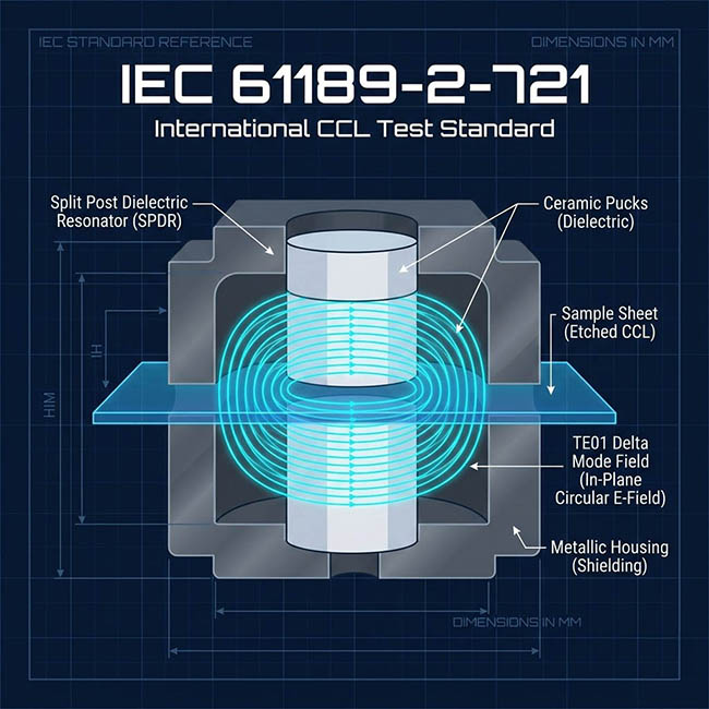 這份由國際電工委員會 (IEC) 制定的標準,確立了使用 分裂柱介電諧振器 (SPDR) 測量微波頻段下 CCL 相對介電常數 (Dk) 與損耗因數 (Df) 的標準方法,與 IPC-TM-650 2.5.5.15 高度對應,此標準特別針對 1 GHz 至 20 GHz 的頻率範圍,提供了一套非破壞性且高精度的測試準則,本文將深入解析該標準的技術核心、樣品製備要求以及測試流程的關鍵細節。