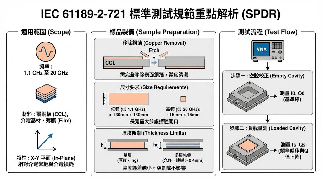 IEC 61189-2-721 強調不應使用查表法 (Lookup Tables),相對介電常數 (Dk) 與損耗因數 (Df) 應透過嚴格的電磁場解算公式獲得。