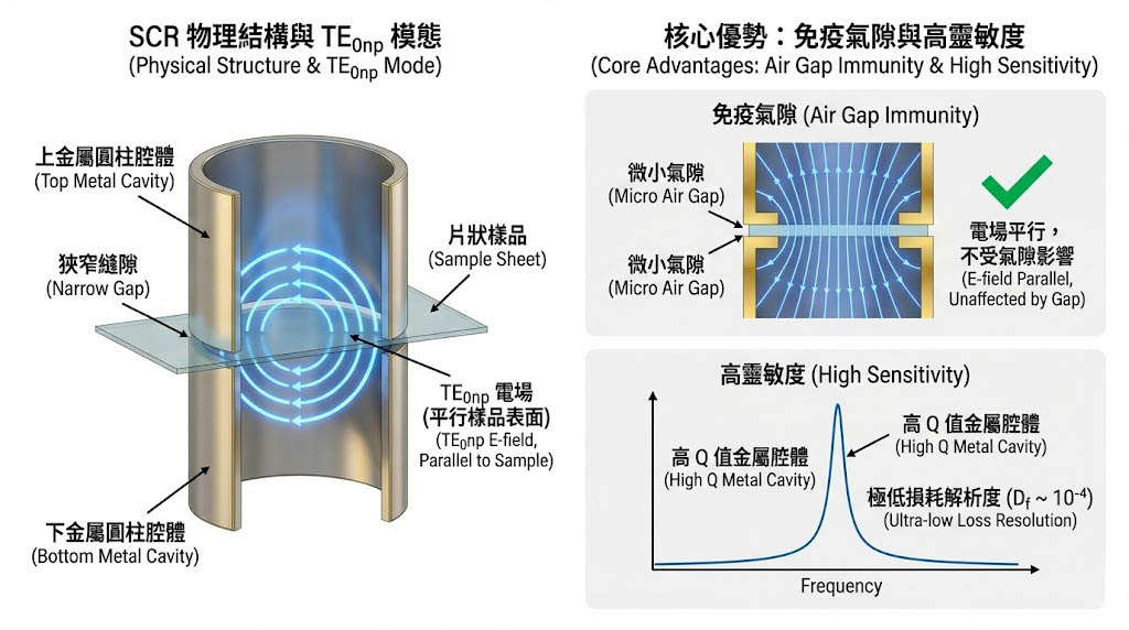與 SPDR 類似,SCR 利用電場平行於樣品表面的特性,大幅降低了樣品與金屬腔體之間「氣隙 (Air Gap)」對量測結果的影響,只要樣品平整地放入縫隙中,微小的接觸間隙不會像平行板電容法那樣造成巨大的 Dk 誤差,此外金屬腔體的高品質因子 (Q 值) 設計,使其對極低損耗 (Ultra-low loss) 材料具備優異的解析度,Df 解析度可達 10^-4 等級。