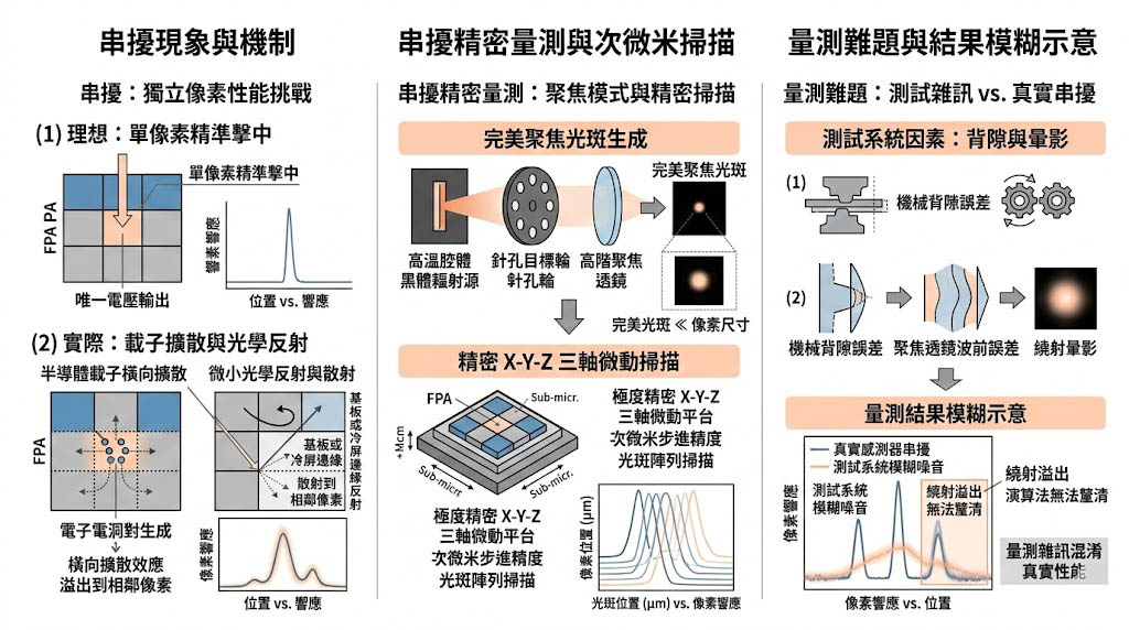 在評估焦平面陣列的獨立像素性能時,「串擾(Crosstalk)」是最致命的物理現象,理想狀態下,當一束極細微的光線精準擊中陣列上的單一像素時,只有該像素會產生電壓輸出;然而在實務上,光子進入半導體晶格後會產生電子電洞對,這些載子可能會因為橫向擴散效應(Lateral Diffusion)游離到相鄰的像素中;此外,光線在基板或冷屏邊緣產生的微小光學反射,也會導致相鄰像素接收到虛假的光能。