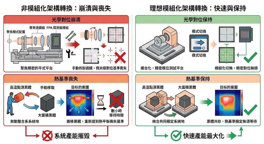 在泛光模式下,測試系統必須移除所有聚焦透鏡,直接將一個大面積、絕對均勻的低溫或常溫黑體輻射源放置在探測器前方,讓均勻的紅外線能量「淹沒」整個焦平面陣列,為了量測絕對線性度,甚至需要同時使用延伸面積黑體與經過斬波器(Chopper)調變的高溫點源進行疊加照射; 實務上最令工程師痛苦的是「測試架構的轉換」,如果測試設備缺乏系統級的模組化設計,工程師在完成聚焦測試後,必須手動拆卸透鏡、搬移高溫黑體,再重新架設大面積黑體,這種物理上的拆裝過程,不僅會徹底破壞原本極為精密的微米級光學對位基準,更會導致設備停機數小時以等待新的黑體達到熱平衡,在需要快速驗證多片晶圓或封裝模組的量產研發階段,這種因架構轉換造成的冗長等待與對位誤差,是摧毀測試產能的最大瓶頸。