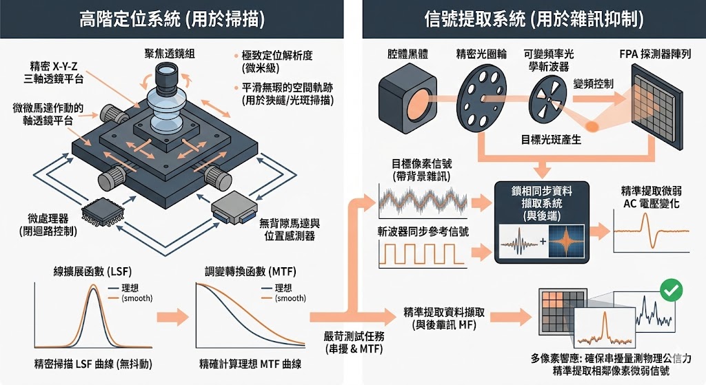 針對串擾與 MTF 測試的嚴苛要求,系統必須配置高階的 X-Y-Z 三軸透鏡平台,此平台必須由微處理器透過閉迴路控制,提供無背隙的極致定位解析度,確保狹縫或光斑掃描時的空間軌跡平滑無瑕,同時為了提高微弱訊號的擷取精度,系統在光路前端必須配置可變頻率的光學斬波器(Chopper)與精密光圈輪,透過將斬波器頻率與後端資料擷取系統進行鎖相(Phase-locked)同步,系統能從龐大的背景熱雜訊中,精準提取出由目標光斑產生的微弱交流(AC)電壓變化,這是確保串擾量測具備絕對物理公信力的關鍵。