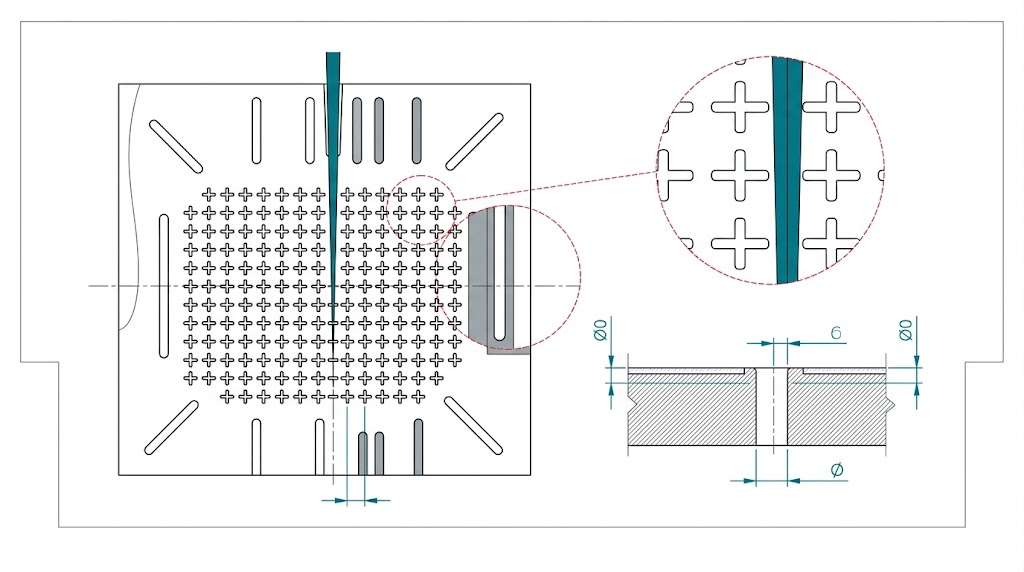 複合材料外殼雷射加工示意圖,展示 FSS 頻率選擇孔與微型散熱槽的幾何細節,放大圖顯示精確尺寸與結構。