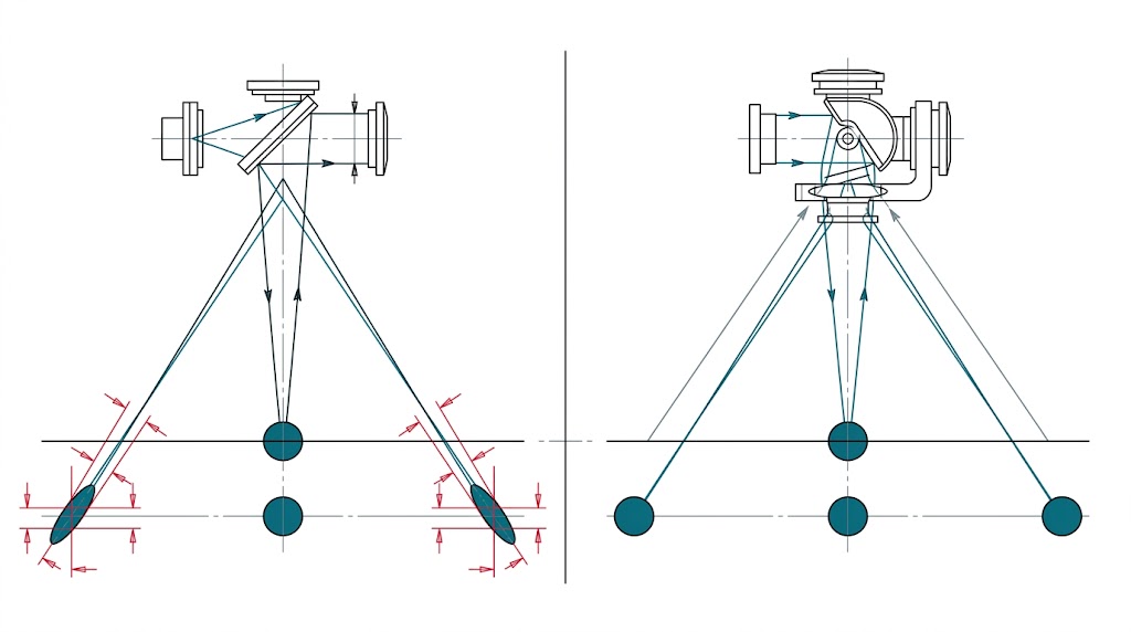 本圖展示光學系統對比。傳統掃描(左)在邊緣產生嚴重的拉長橢圓光斑畸變;單點轉向掃描頭(右)則保持完美、一致的圓形光斑,確保無偏差性能。