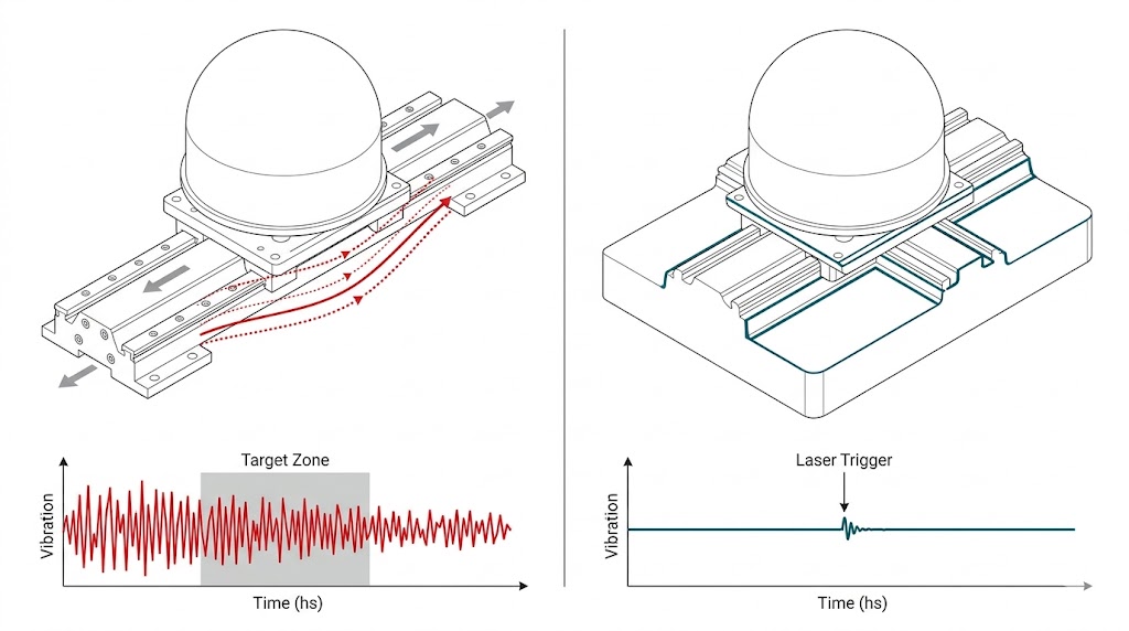 大型載荷移動對比:左側標準鋁型材結構因剛性不足產生嚴重共振(紅色波形),延遲了操作;右側整合花崗岩(IGM)系統剛性極高,消除了振動,實現了零延遲精確定位(深青色線)。