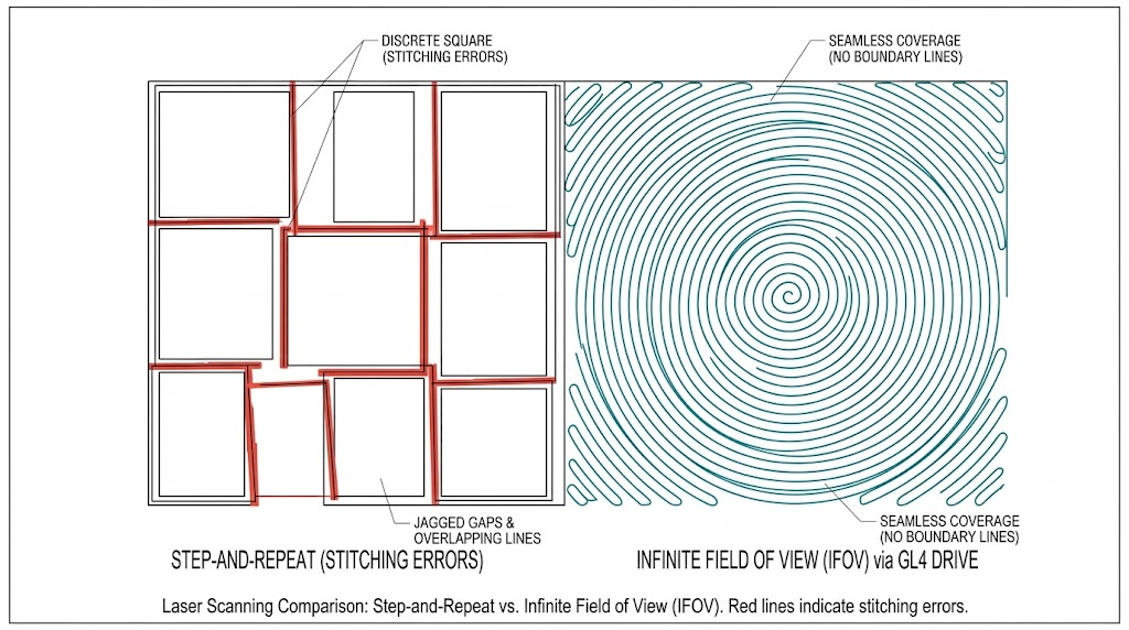 雷射掃描方法對比:步進重複法(左,紅色)導致拼接誤差(間隙與重疊);無限視場法(右,深青色)通過 GL4 驅動器實現無縫連續覆蓋。