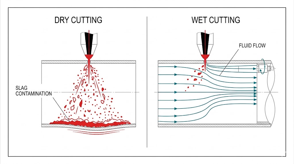 此技術圖表比較了乾式切割與濕式切割。乾式加工導致熔渣堆積污染(左),濕式加工藉由內部流體沖刷(右),即時排出熔融物,確保切割表面乾淨無殘渣。