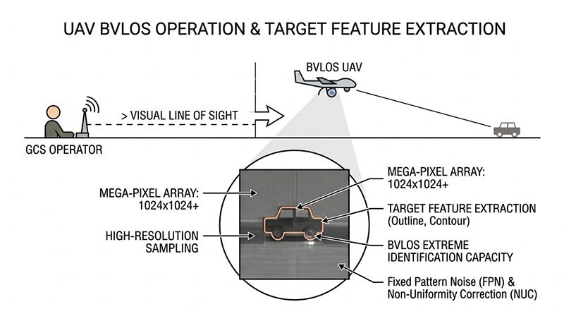 隨著邊緣運算與神經網路演算法的微縮化,無人載具 (UAV) 的光電酬載系統已全面跨入百萬畫素等級的大陣列時代,無論是基於非冷卻微測輻射熱計 (Microbolometer) 還是高階冷卻型中波紅外線 (MWIR) 探測器,感測器陣列的幾何規模已從傳統的標準畫質急遽擴張至 1024x1024,甚至朝向 2048x2048 的超大像素矩陣 (Mega-pixel Arrays) 邁進,這種空間取樣頻率的指數級增長,賦予了無人機在超視距 (Beyond Visual Line of Sight, BVLOS) 條件下極致的目標特徵提取能力;然而,從半導體晶圓製造與焦平面陣列 (FPA) 或發射器陣列的物理本質來看,當陣列規模擴大時,像素間的幾何尺寸公差、熱傳導係數變異、以及光電轉換增益的非線性漂移,會以統計學上的機率分佈擴散至整個視場中,這些微觀的物理缺陷,最終將在影像上疊加形成高頻的空間固定模式雜訊 (Fixed Pattern Noise, FPN) 與低頻的區域性熱梯度。