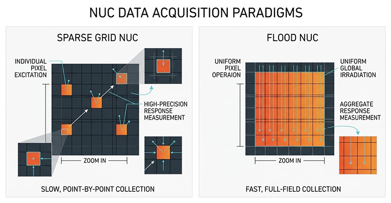 對於 2026 年主導軍工與航太應用的 AI 機器視覺系統而言,影像數據的「輻射絕對純淨度」遠比人類視覺的動態對比度更為關鍵,任何殘留的空間雜訊,都會在卷積神經網路 (CNN) 的邊緣檢測層中被錯誤解譯為實體特徵,進而引發追蹤演算法的災難性脫鎖;因此,為了抹平這些先天物理差異,系統必須執行極度嚴格的非均勻性校正 (Non-Uniformity Correction, NUC)。 在過去十年的工程實務中,NUC 演算法主要依賴兩種截然不同的資料採集範式:「稀疏網格法 (Sparse Grid NUC)」與「泛光法 (Flood NUC)」,稀疏網格法透過逐一激發相互隔離的像素,能精確量測單一像元的獨立輻射響應;而泛光法則透過全域一致的熱輻射照射,以極快的時間獲取整體的巨觀響應。