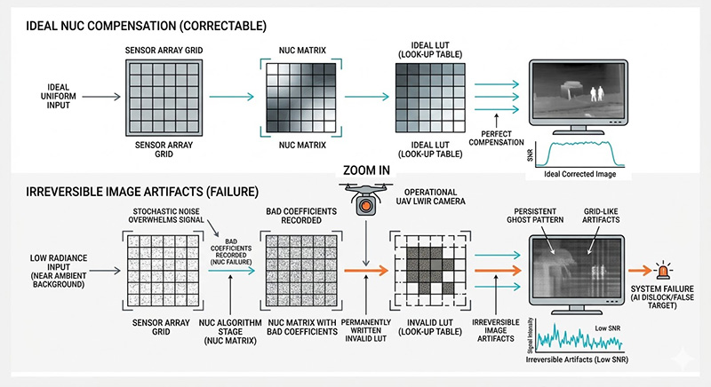 然而,隨著測試規範的要求逐漸逼近熱力學雜訊極限,單一的 NUC 演算法在應對新一代高動態範圍、大陣列系統時,已遭遇了不可跨越的物理與數學壁壘,現代無人機不僅需要偵測極端高溫的尾焰,更需要在接近環境背景溫度 (Ambient Background) 的極低輻射條件下,分辨出只有數十毫開爾文 (mK) 溫差的隱蔽目標,在這種極低輻射區間,光子的隨機泊松雜訊 (Poisson Noise) 與系統的熱電子雜訊,會嚴重干擾校正矩陣的收斂,若強行採用傳統演算法進行全域補償,不僅無法消除雜訊,反而會將錯誤的修正係數寫入查找表 (LUT) 中,造成不可逆的影像假影 (Artifacts),這迫使光電測試領域必須從根本上重構 NUC 的數學模型與擷取邏輯,以滿足最嚴苛的量測標準。在實務操作上,測試工程師與演算法架構師正面臨著以下三大極度棘手的技術難題。