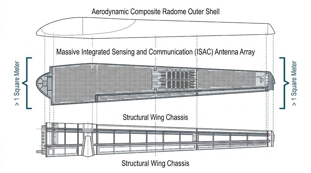 此圖展示了複合天線罩、中部大於1平方米的巨型整合傳感與通信 (ISAC) 天線陣列,以及底部的機翼底盤及其裝配。