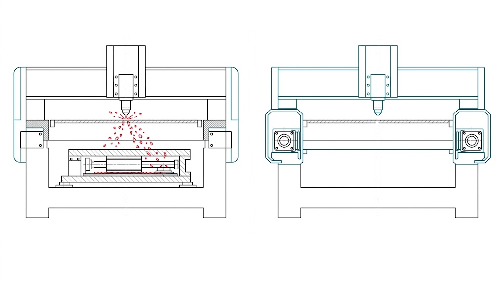 同時,大行程運動所必需的外部纜線管槽(e-chain),若設計不良或彎曲半徑過小,內部的光纖與高頻資料線會在幾百萬次的來回彎折中產生金屬疲勞並斷裂,無法在機構物理層級將「驅動元件」與「加工污染區」徹底隔離,是許多大型雷射加工機台頻繁當機的最大致命傷。