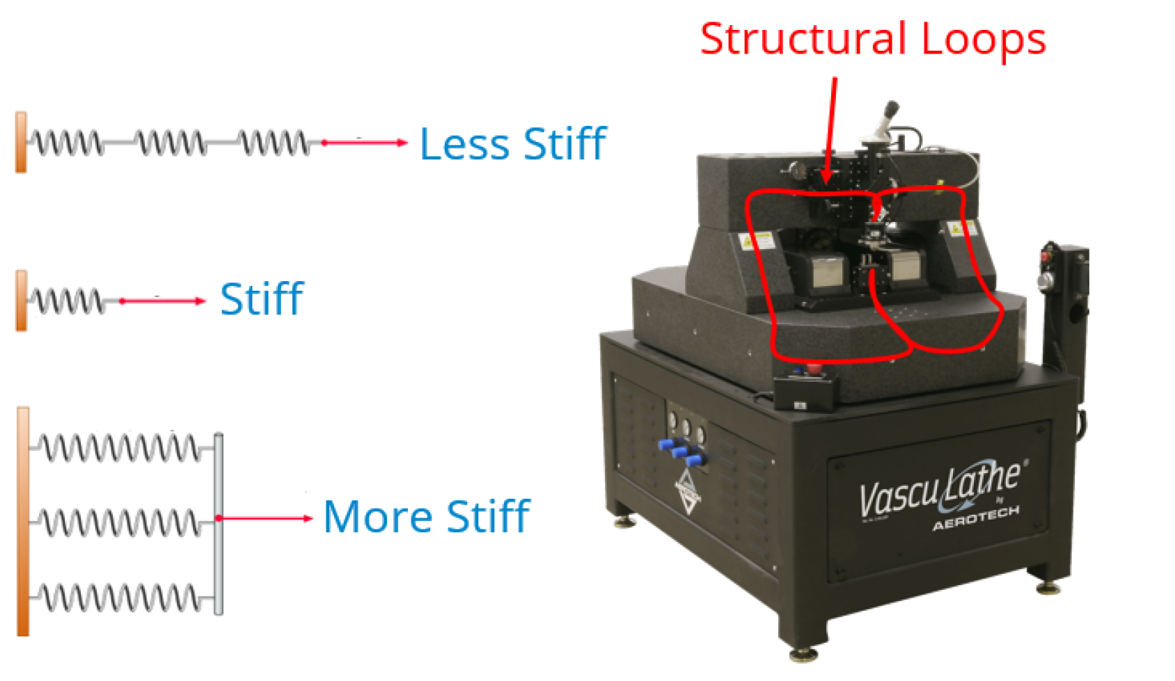 所謂結構迴路,是指機器運動所產生的作用力傳遞至穩固地面,或傳遞至相應結構元件中產生大小相等、方向相反反作用力的完整路徑。我們可以想像,構成機器結構元件的材料彷彿是由數千個微觀彈簧以串聯方式連結而成的集合體,在這樣一個串聯鏈中增加更多的彈簧(即增加結構件的複雜度或長度),實際上會降低整個鏈條的剛性;因此,設計者應致力於縮短彈簧元件構成的結構「鏈」,藉此有效增強機器的剛性;此外,若將彈簧元件改以平行方式增加,則能使鏈條更加堅固;為了獲取最大可能的剛性,設計者應當在機器框架中,策略性地增加能夠備援支撐慣性力的結構元件;機器越是堅固,就能夠注入更多的能量至其結構中,而不會引起不必要的微小運動,這使得使用者能夠以更快的速度、更大的加速度和更高的能量來驅動運動控制元件,同時將不可觀察的加工誤差降至最低;圖 1 清晰描繪了機器結構迴路以及彈簧元件在串聯與平行排列時對剛性的不同影響。