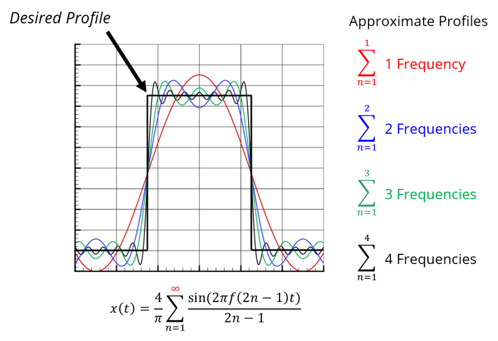 一台具備更高剛性的機器,能在承受更多能量注入時顯著減少彎曲變形,從而為系統的其他關鍵部分節省下寶貴的誤差預算,這無疑是一項直接而顯著的性能改進,同時也為提升產出率的下一個焦點領域——機器動力學原理——鋪平了道路,隨著運動平台和機器框架的剛性不斷增強,它們固有的自然頻率也會隨之提高,而伴隨著其自然頻率的提升,系統的可控性以及在通常意義上更快生產產品的綜合能力也將得到增強;每一個複雜的運動軌跡——亦即雷射光點為製造出合格零件所需遵循的精確路徑——對於參與產生該運動的每一個獨立軸而言,都內含其特定的頻譜內容,傳送給各軸的運動指令中,包含了一定頻寬範圍內的正弦波組合,這些正弦波是透過數學級數或總和來精確表示複雜運動指令所必需的;圖 2 展示了一個理想化的步階函數,以及如何使用有限頻寬的正弦波來近似此函數的範例。