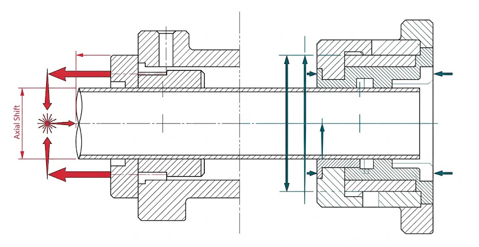 雷射加工對比示意圖:傳統筒夾夾持工件產生軸向位移(如紅標),LaserTurn160 定長筒夾無位移。
