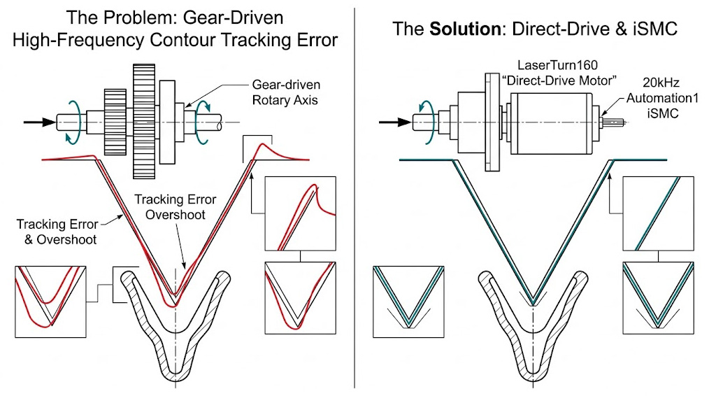 傳統齒輪驅動(左)因追隨誤差導致支架 V 型支柱幾何圓滑變形,LaserTurn160 直驅搭配 iSMC(右),精確實現完美尖銳幾何與極致幾何保真度。