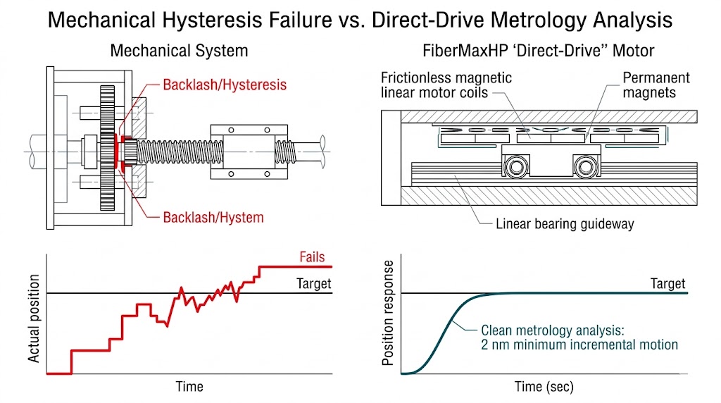 對比傳統機械(左,背隙導致失敗)與直驅技術(右,奈米精度命中目標)