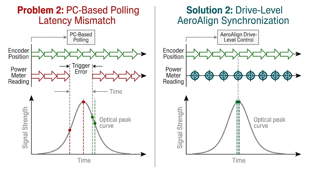 此圖對比基於 PC 的輪詢(左,存在觸發錯誤導致不同步)與驅動器級 AeroAlign 同步(右,精確一致),後者能精確捕獲光學峰值。