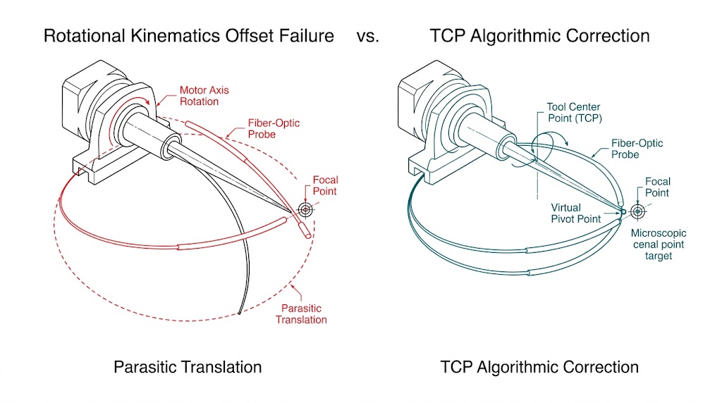 圖解對比旋轉運動偏移偏差(寄生平移)與TCP算法校正,紅色顯示偏差;深青色利用虛擬樞軸點精準鎖定目標。