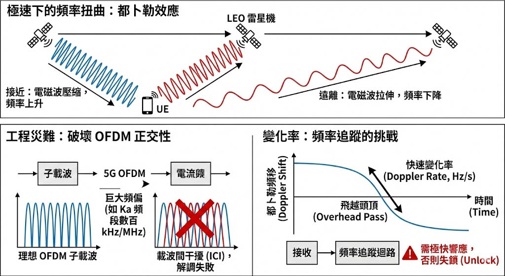 在 Ka 頻段(約 30 GHz),7.6 km/s 的速度會造成高達 數百 kHz 甚至 MHz 等級 的頻率偏移,對於採用正交頻分多工(OFDM)技術的 5G 系統而言,這是一場災難,OFDM 依賴子載波之間的精確正交性,巨大的頻偏會破壞這種正交性,導致嚴重的 載波間干擾(ICI,使解調變失敗。
