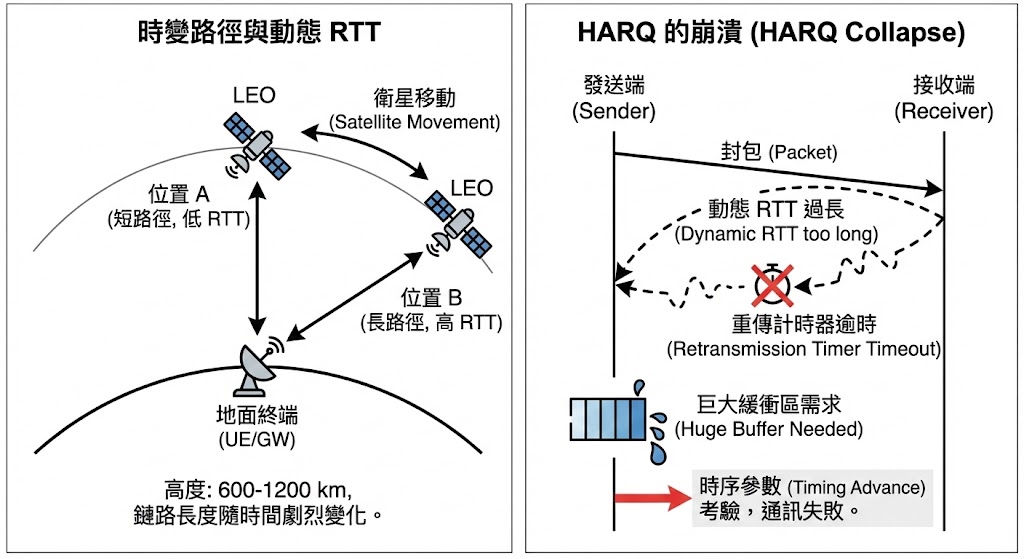 5G 協定中依賴 混合自動重傳請求(HARQ 機制來確保資料正確,這是一種「停等」協定,發送端在送出封包後會等待接收端的確認(ACK),如果 RTT 過長且不斷變化,會導致重傳計時器逾時,或者需要巨大的緩衝區來處理飛行中(In-flight)的封包,這對通訊協定的時序參數(Timing Advance)是一大考驗。