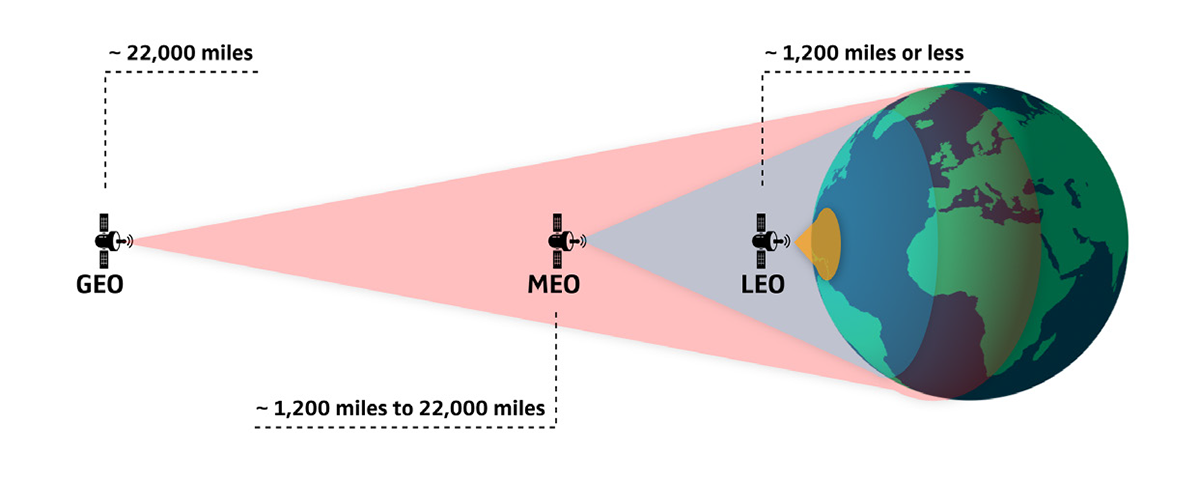 圖 1:GEO、MEO 與 LEO 的部署軌道高度示意圖。