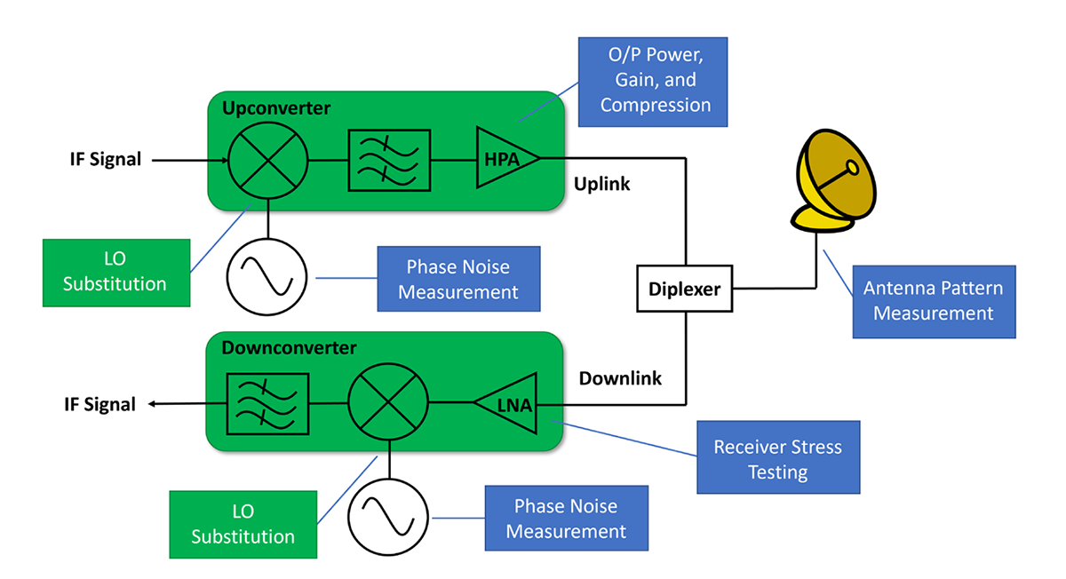 地面站,當其連接至地面網路時亦稱為閘道,扮演著衛星網路與地面網際網路或私有網路之間的橋樑角色,是上行與下行鏈路操作中的關鍵樞紐,如圖 2 所示,構成上行與下行路徑的各個模組(如混頻器、濾波器、放大器等),需要在不同階段進行多樣化的測試,以確保最終的運作穩定性,這類測試可能在模組的開發與生產階段、系統整合期間、現場故障查找過程,以及日常的運營監控中執行,其目的在於確保每個元件乃至整個系統都符合嚴格的效能規範。