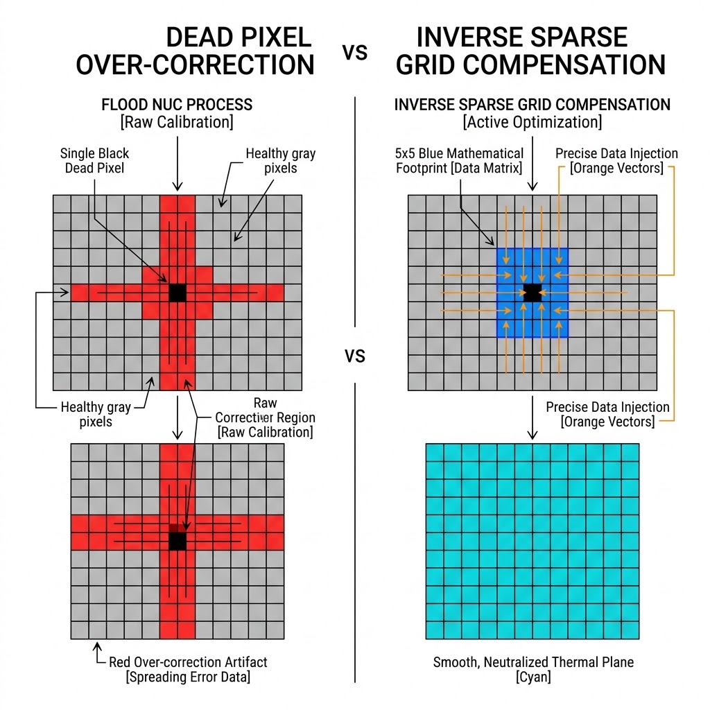 因為泛光 NUC 演算法在計算時,已經「看」不到那個輻射凹洞,所以絕對不會對周圍的健康像素下達錯誤的增壓指令,最終計算出的 NUC 矩陣,能完美維持壞點周圍像素的原始均勻度,徹底消滅十字偽影與光暈。