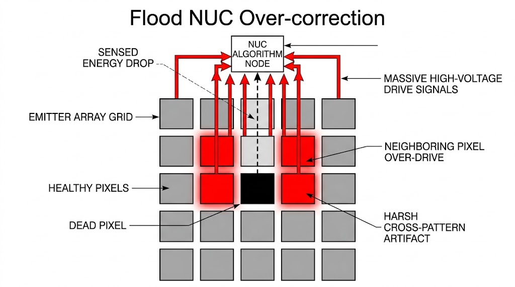 在進行泛光 NUC 時,系統會點亮所有發射器像素並使用紅外線相機進行大面積影像擷取,由於發射器像素的幾何尺寸通常遠小於相機的單一像素,相機實際上是在「平均」接收周圍多個發射器的總輻射能量,當陣列中存在一個不發光的壞點時,相機會偵測到該區域的總亮度低於平均值,此時泛光 NUC 演算法會誤以為是「該區域整體發光能力不足」,進而錯誤地大幅提升該壞點周圍「健康像素」的驅動電壓,這導致壞點無法被修復,反而使其周圍的像素變得異常明亮。