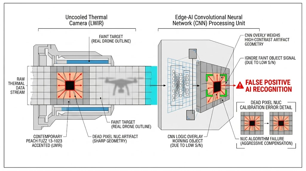 上述的過度補償現象,會在紅外線影像的壞點周圍形成極度突兀的明亮十字形 (Cross-shaped) 或光暈狀 (Halo) 偽影,現代 AI 卷積神經網路 (CNN) 是高度依賴影像中的「高頻空間梯度 (Spatial Gradient)」與「邊緣對比度」來提取目標特徵,這些由 NUC 演算法人為製造出的極端明亮幾何圖形,會被神經網路的濾波器誤判為「具有高度威脅性的真實目標(如微型無人機或高溫熱源)」,這種硬體瑕疵引發的「虛警 (False Positive)」,將導致 AI 尋標器在虛擬戰場中瞬間脫鎖,徹底摧毀 HWIL 測試的公信力。