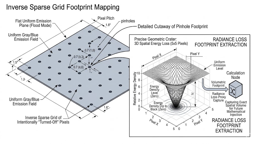 系統首先會投射一張特殊的「反向稀疏網格」——這是一張點亮所有像素的泛光影像,但故意將特定網格狀的健康像素「關閉」,藉此完美模擬壞點的物理狀態。 - 5x5 能量足跡映射: