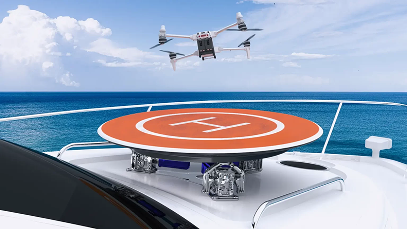 圖示為安裝於船舶上的無人機起降穩定平台,正引導一架無人機進行作業。該平台能主動抵銷船體晃動,確保無人機在移動的船舶上也能安全精準地起飛與降落,拓展了無人機在海洋環境下的應用範圍。