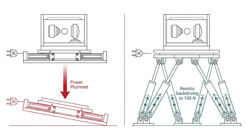 示意圖說明低摩擦直線平台斷電存在反向驅動墜落風險(左);抗反向驅動設計平台(右)即使喪失電力仍能穩固負載,確保安全。