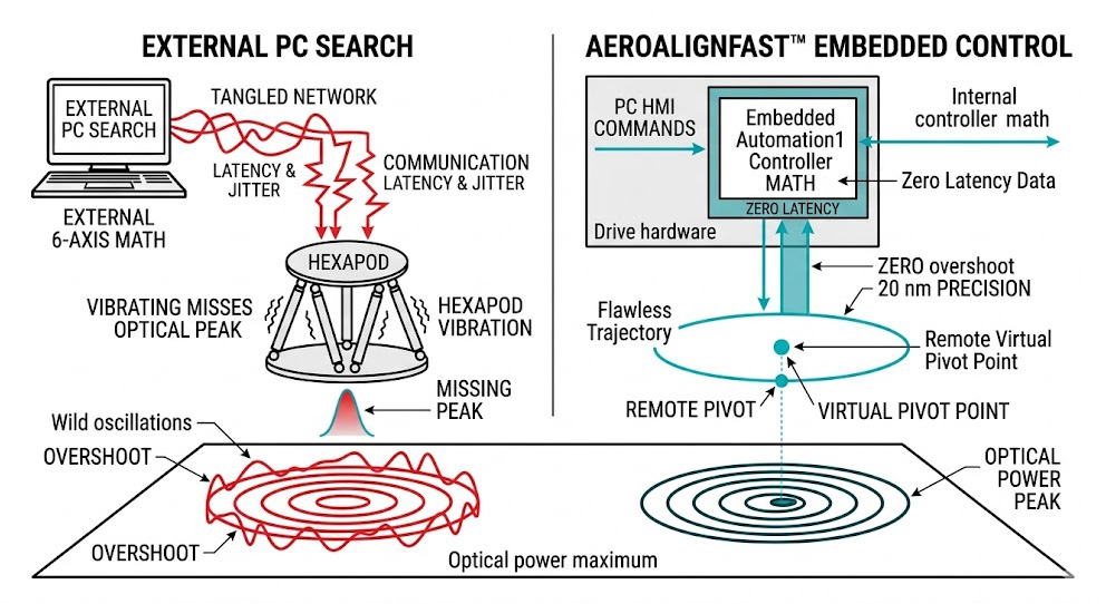 示意圖對比外部 PC 與嵌入式控制,外部控制因網路延遲抖動導致六軸平台震動,偏離光學峰值,AeroAlignFast™ 嵌入式控制具零延遲數據運算,達成 20奈米精度與無超調的完美軌跡定位。