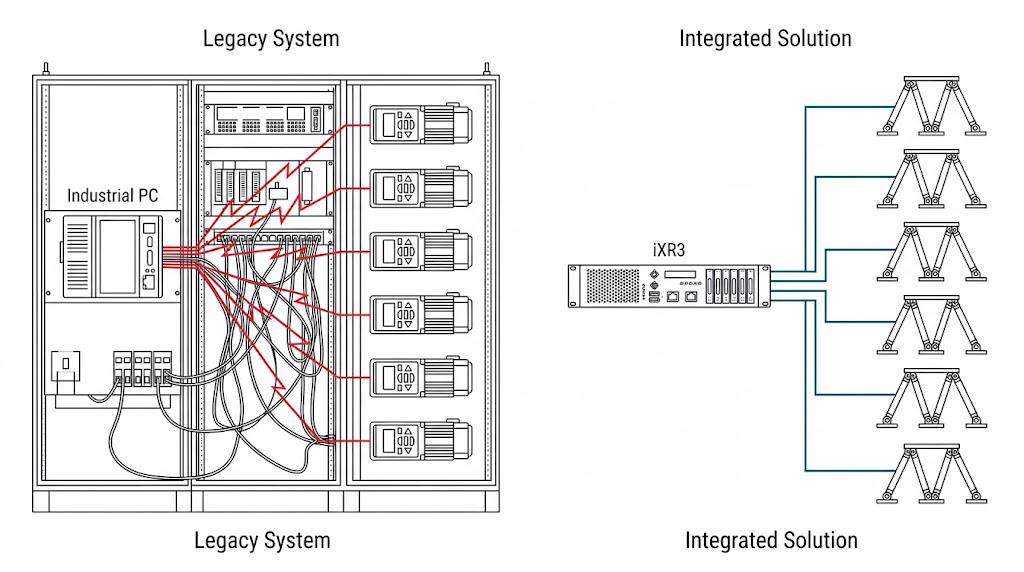 圖表對比了傳統龐大的機櫃架構(左)與 iXR3 整合解決方案(右),iXR3 將工業 PC 與六軸驅動器整合在 1U 單元中,大幅簡化了配線與空間。