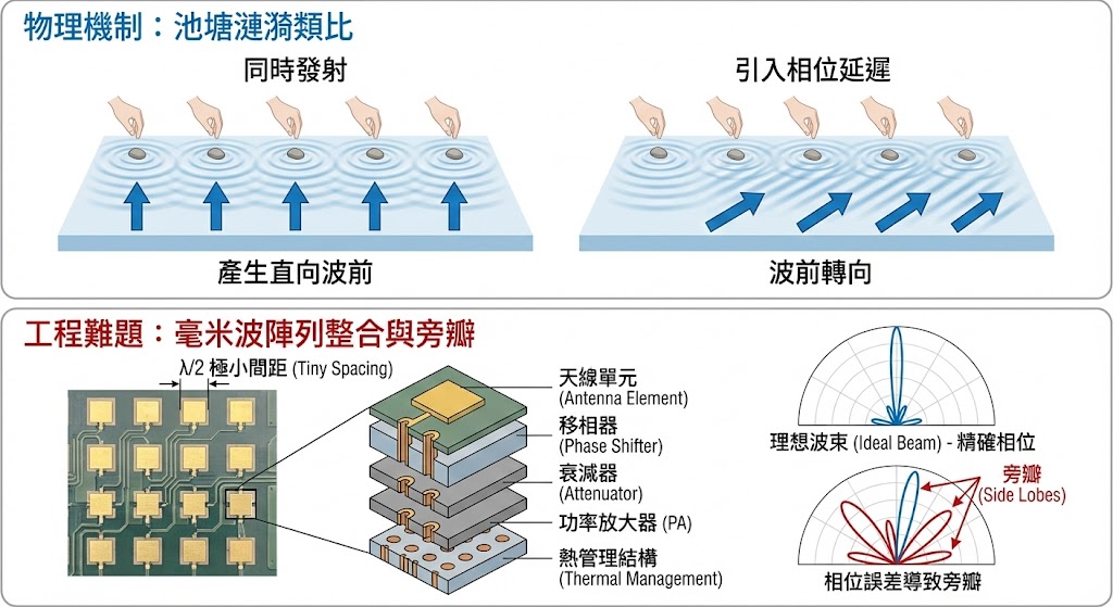- 工程難題:在毫米波頻段,波長僅有數毫米,這意味著每個天線單元的間距極小(通常為半波長),且相位控制必須達到極高的精確度,若相位誤差過大,不僅波束指向會偏移,還會產生巨大的「旁瓣 (Side Lobes)」,導致能量浪費並干擾其他系統,工程師必須在極小的空間內整合移相器 (Phase Shifter)、衰減器與功率放大器,這對 PCB 佈局與熱管理是極大考驗。