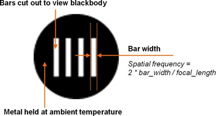 圖2:一個標準四條槓目標板的示意圖,它定義了特定的空間頻率,並利用其後方的黑體來設定觀察目標與背景之間的溫差。通常,目標板本身接近環境溫度,而黑體溫度則被精密控制以產生正溫差(目標亮)或負溫差(目標暗)。