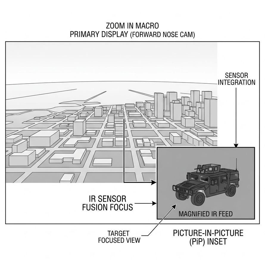在軟體層面,MANTIS 即時場景管理軟體 內建了強大的多通道合成(Multi-channel Composition)能力,其多視角外掛模組(Multi View Plug-In)允許在單一顯示通道內,動態嵌入多個獨立的渲染視窗(Insets),例如:後視鏡或機腹觀測視角,這種子母畫面(PiP)功能不僅節省了實體螢幕的配置空間,更能精確重現現代戰機或無人機地面控制站(GCS)中,將多種感測器畫面融合於單一多功能顯示器(MFD)的真實介面。