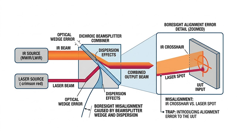 傳統上,為了解決跨頻譜測試需求,工程師會使用多個獨立的光源(熱黑體、可見光積分球、雷射發射器),並依賴龐大且複雜的「二向色分光鏡 (Dichroic Beamsplitters)」將這些光束在物理空間中強行合併,然而分光鏡天生存在光學像差、色散效應以及穿透/反射路徑的幾何偏差,在進行融合感測器的「瞄準軸共位校準 (Boresight Alignment)」時,任何由測試機台分光鏡引入的微小光楔誤差或機械漂移,都會導致投射到 UUT 的紅外線十字準星與雷射目標在空間中發生錯位,這使得系統將測試設備自身的幾何瑕疵,誤判為融合感測器內部的組裝公差,徹底摧毀了跨頻譜共軸校準的絕對基準。