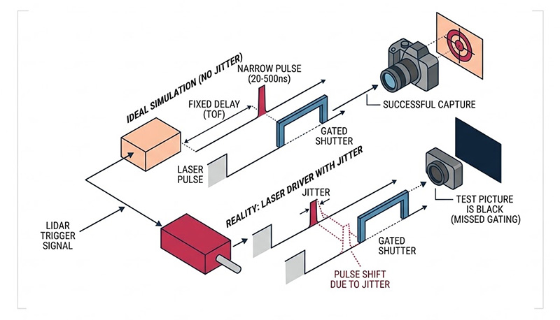 測試距離閘控相機 (Imaging LIDAR) 時,測試光源必須模擬真實戰場上的「光子往返飛行時間 (Time-of-Flight)」,這要求測試系統必須在接收到相機的觸發訊號後,經過一段精確計算的微秒級延遲,再發射一個脈衝寬度極窄(例如 20ns 至 500ns 之間可調)且邊緣極度銳利的雷射脈衝,若測試光源內部的雷射驅動電路存在微小的時脈相位抖動 (Jitter),或是無法提供足夠的動態衰減範圍來模擬大氣損耗,距離閘控相機的極速快門將會「錯過」這道模擬回波,導致測試畫面呈現一片漆黑,要將這種高頻電子時序控制完美整合進龐大的光學測試機櫃中,是一項極端的系統工程挑戰。