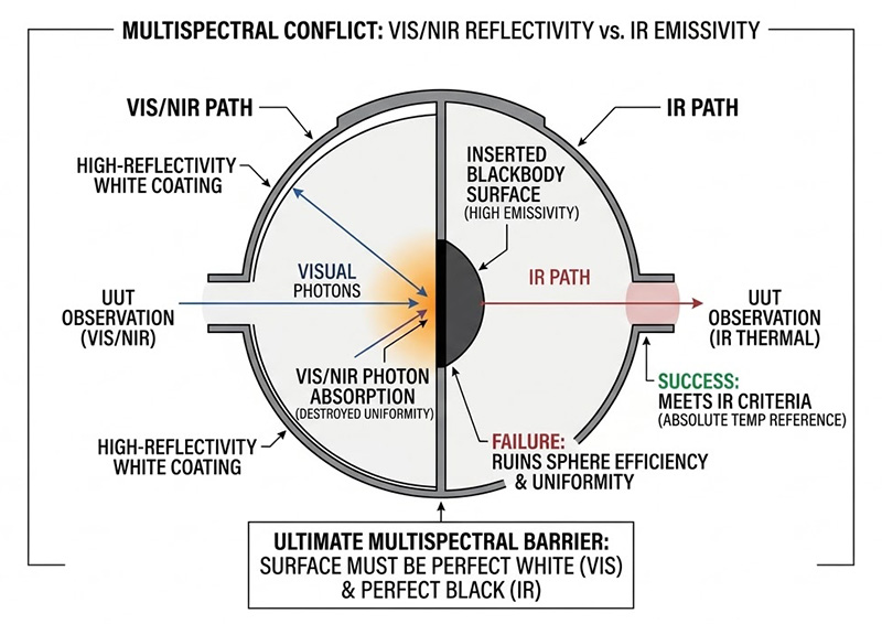 為提供均勻的可見光與近紅外光 (VIS/NIR) 照明,系統必須使用內部塗滿高反射率白色塗層的「積分球 (Integrating Sphere)」,但同時為了提供純淨的紅外線背景,系統又需要一塊具備高發射率(極黑)的黑體表面,這在材料學與幾何光學上形成了一個死結:如果將一塊黑色金屬板插入積分球內,它會像黑洞一樣吸收掉球體內部的可見光子,徹底摧毀積分球的均勻度與光學吞吐量;若不放黑體,又無法提供校準熱像儀所需的絕對溫度基準,如何在同一個物理空間內,讓一個表面「在可見光下是完美的白體,在紅外線下卻是完美的黑體」,成為多光譜光源開發的終極物理壁壘。