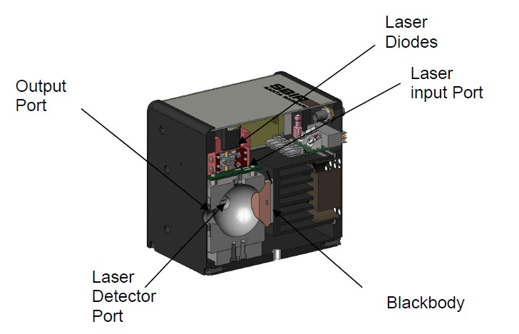 SBIR 多光譜光源 (MSS) 剖面圖,此剖面顯示了黑體、雷射二極體組件、雷射偵測器埠與輸出埠