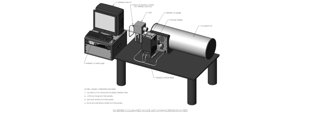 這些功能完善的目標投影儀系統,其標準配置通常包含高光學品質的準直儀 (collimator),用於將測試靶標精確投影至無窮遠,模擬真實觀測場景;一個可提供均勻且亮度可調的可見光積分球光源(例如 SBIR 的 Infinity VSX 寬頻光源,其光譜範圍可覆蓋 NIR/SWIR 區域),用於進行靈敏度測試、平場校正以及 NEI 等參數的量測。