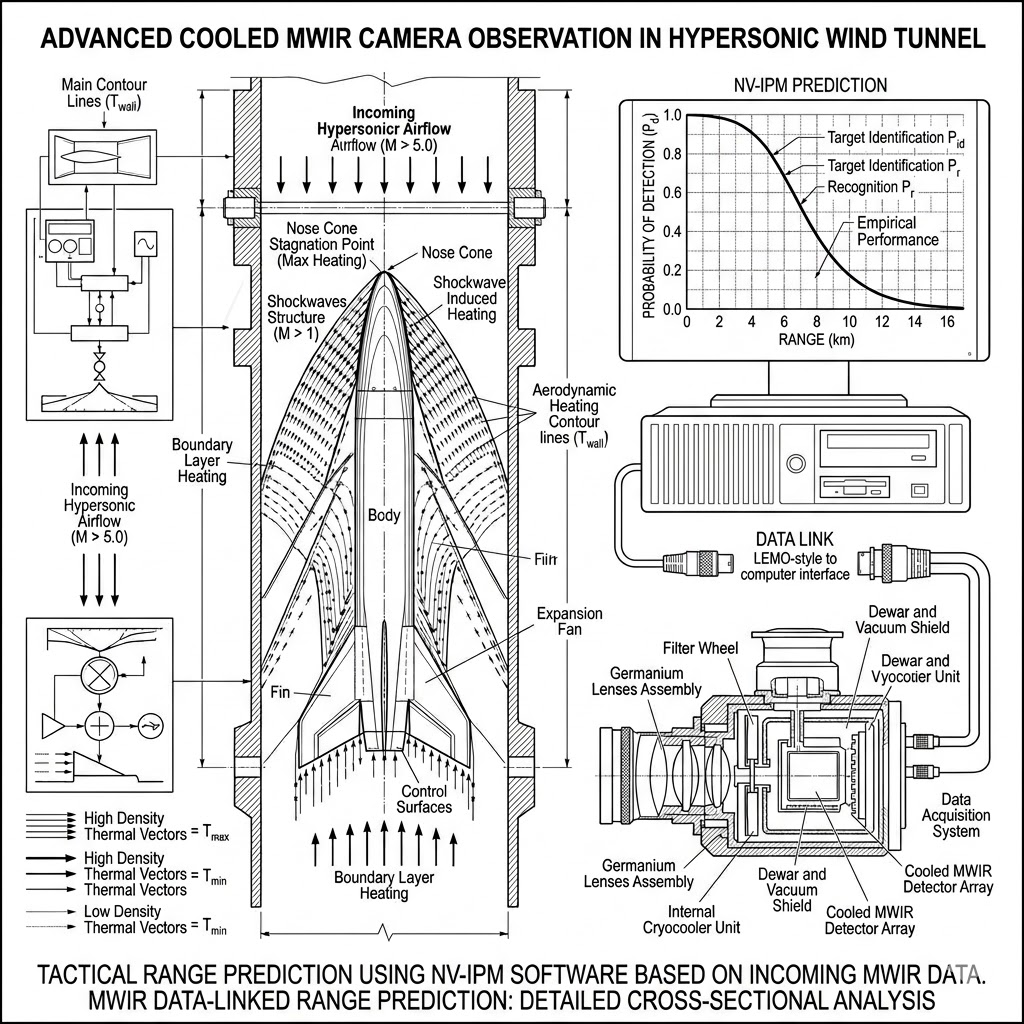 示意圖為先進中波紅外線相機與測試工作站進行深度整合,系統自動將精密量測矩陣無縫轉換為戰術測距機率曲線,實現從硬體測試到真實效能預測的自動化閉迴圈