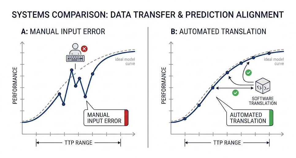 示意圖中為手動轉譯龐大的量測參數極易引發單位轉換誤差與小數點丟失。唯有透過專屬的軟體轉換模組,才能確保硬體數據完美映射至戰術效能預測曲線,消弭斷層
