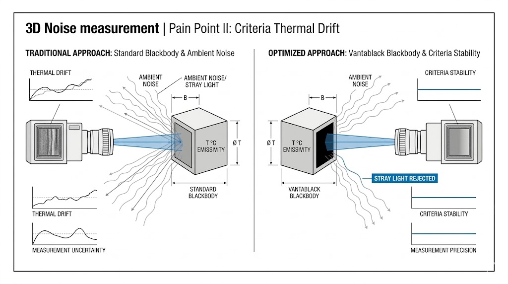 示意圖中為當傳統黑體發射率不足,易將環境雜散熱反射入鏡頭,導致系統嚴重誤判空間雜訊比例,Vantablack 極致黑體能徹底吸收干擾,提供高保真度的熱均勻度基準